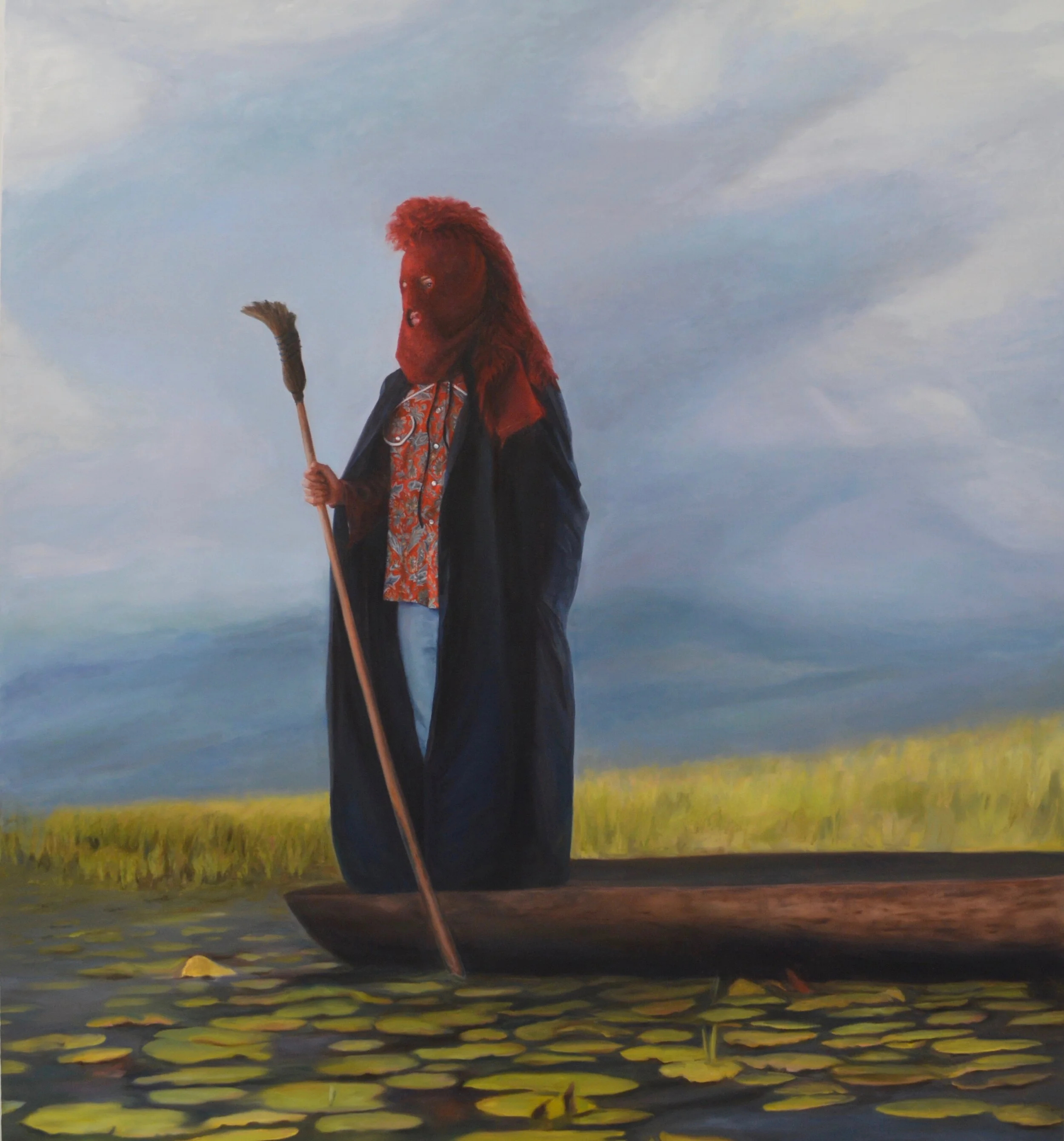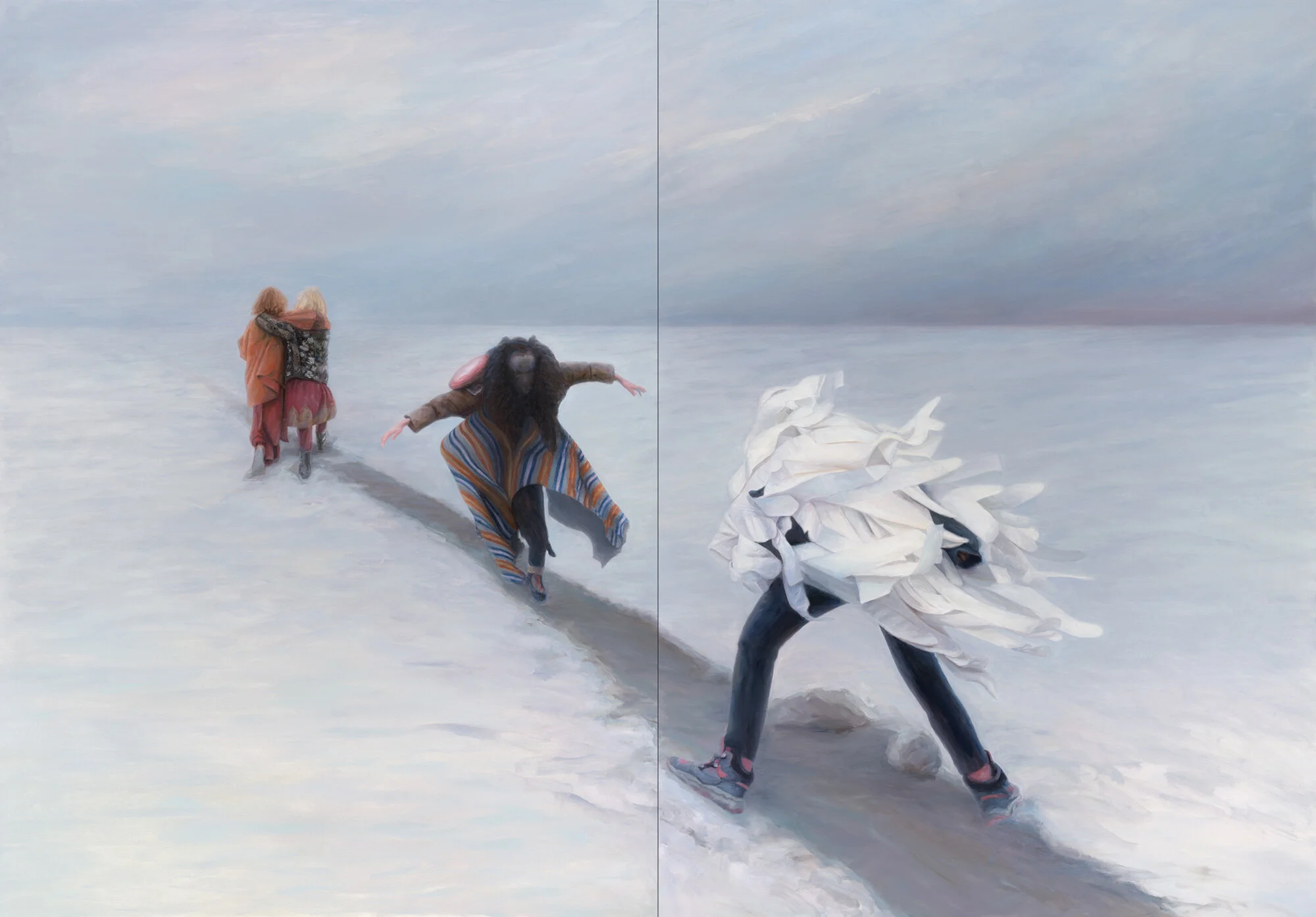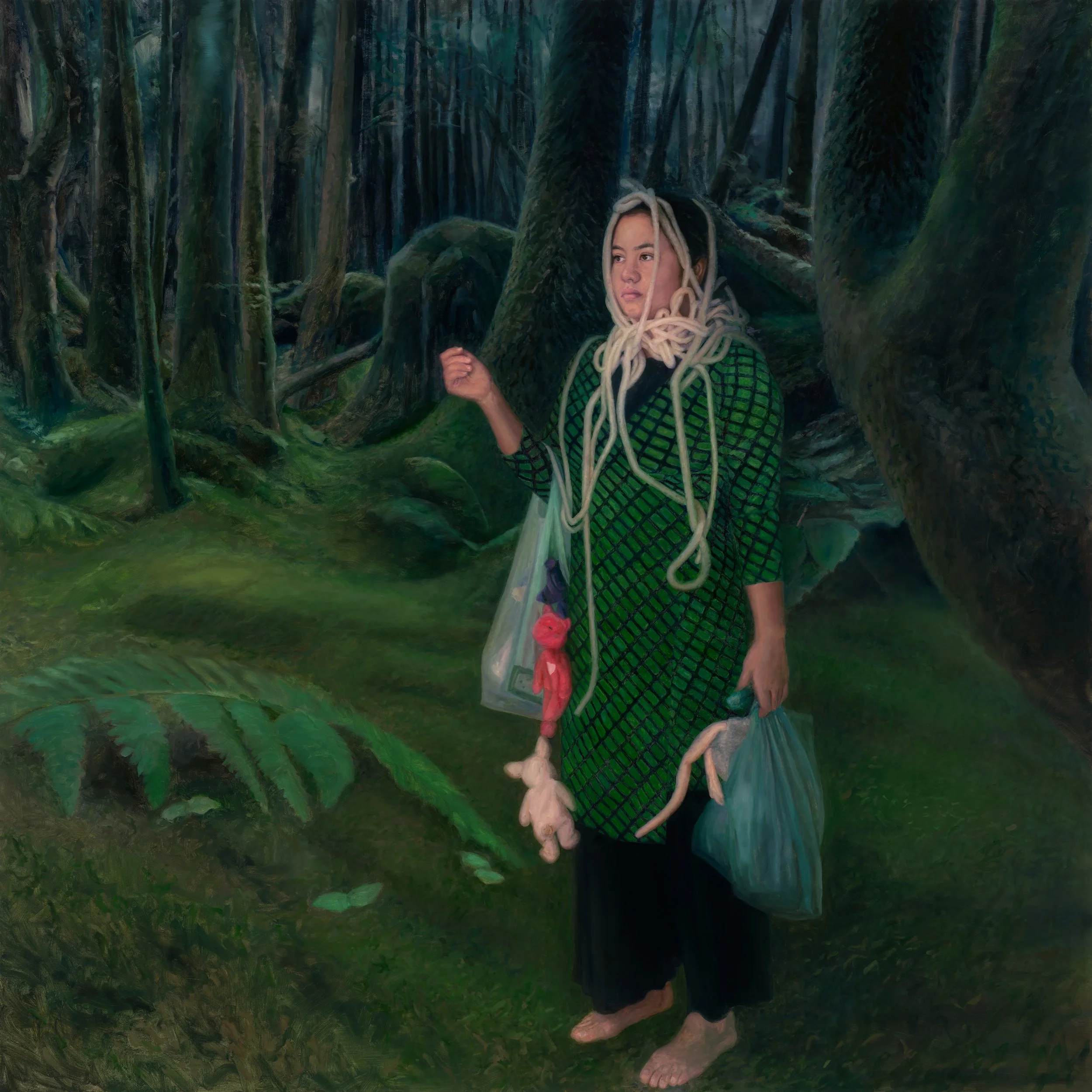 As if plucked from a folk carnival or political protest, Tamera Avery’s masked and costumed protagonists reappear in curiously liminal spaces: on the edge of a glacier, in a post-nuclear bunker, in a forest gloaming. Each surreal environment is rich with possibility and wrought by uncertainty. Within them, young wayfinders forge unlikely paths, transforming ordinary things – plastic gloves, an upturned handbag, abandoned toys, an old scarf – into extraordinary armor for selfhood.